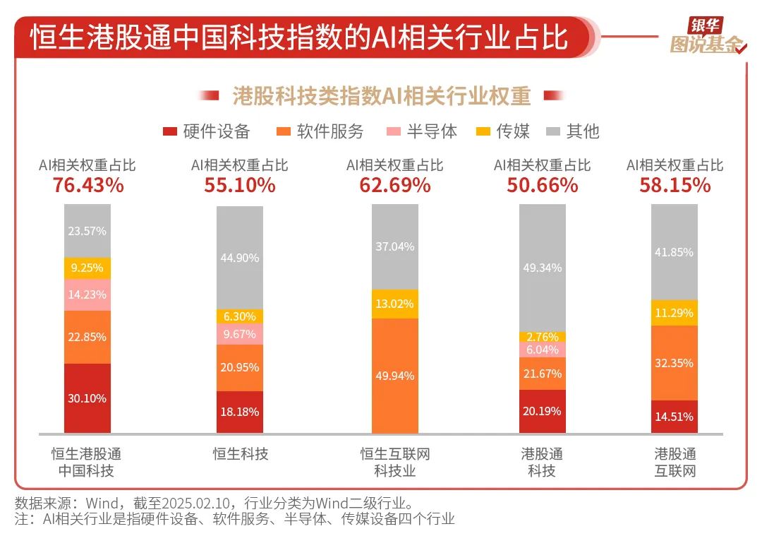 3、恒生港股通中国科技指数聚焦于半导体、硬件设备、软件服务、传媒等AI直接相关行业,AI相关行业合计权重达 76.66%,显著高于恒生科技、恒生互联网科技业、港股通科技和港股通互联网指数。