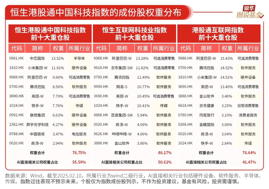 1、恒生港股通中国科技指数(HSSCT.HI)是反映港股通范围内中国科技企业表现的一个重要指标,涵盖港股市场中具有代表性的科技公司,特别是人工智能(AI)、互联网、半导体、消费电子和传媒等领域的龙头企业。