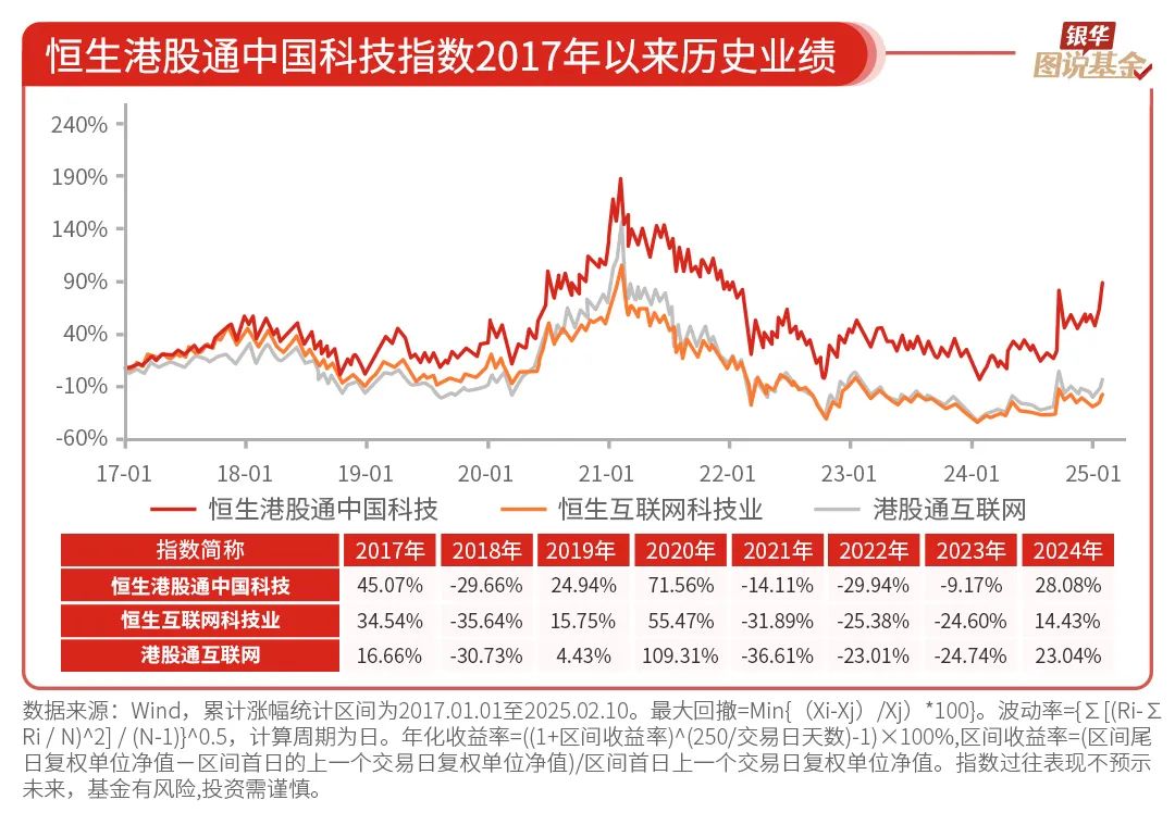 6、恒生港股通中国科技指数自基日以来,虽然经历了较大幅度的波动,但整体上实现了正向的收益率。截止2025年2月10日,恒生港股通中国科技指数累计涨幅为125.54%,年化收益率为8.52%。