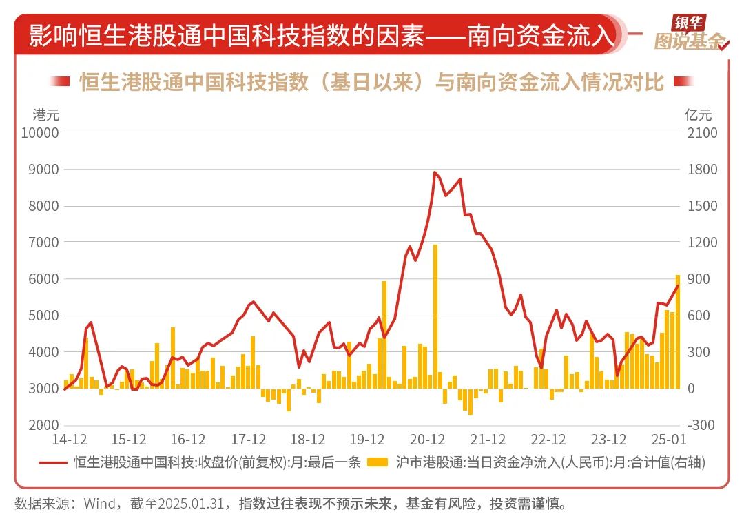 11、南向资金(即内地资金通过港股通渠道投资港股)是港股市场的重要资金来源之一,通常被视为内地投资者对港股市场信心的体现。从南向资金月度流入数据来看,当净流入金额呈上涨趋势时,会直接推高港股市场的流动性,从而推动恒生港股通中国科技指数的上涨。