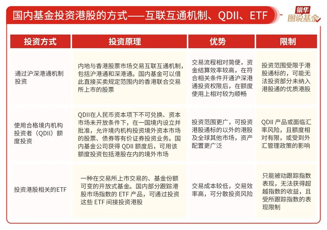 12、国内基金有多种投资方式可以布局港股,主要包括互联互通机制、QDII、ETF三大类,每种方式有各自的优势与限制。对于投资者而言,可以根据需求选择不同类型的基金,满足布局港股的需要。