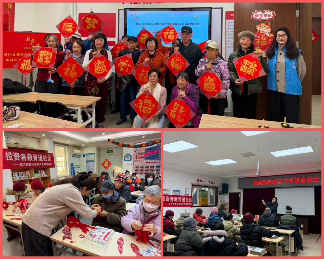 为深入贯彻落实北京市打非工作小组办公室及北京证监局关于加强岁末年初金融安全保障的工作部署,切实提升社会公众、特别是老年群体的风险防范意识,东方财富证券投资者教育基地于1月14日、15日及19日,先后深入北京市朝阳区樱花园社区、武圣东里社区及关东店北街社区,成功举办了以“增强防范意识,远离诈骗陷阱”为主题的系列投资者教育专项活动,共71名居民到场参加。