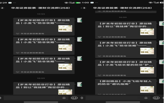 依托数字化宣传手段,营业部于2026年2月10日通过CRM短信平台向存量投资者定向发送防非提醒短信共计6374条,结合新春佳节节点,在传递节日祝福的同时,明确提醒客户拒绝高利诱惑、远离非法金融活动,坚守理性投资理念。同时,在华龙证券股票理财交流群面向258名投资者,常态化推送【岁末年初防非打非】专题知识,针对不同群体风险特点,发送影视投资骗局、消费返利骗局、长辈防非“护身符”、年轻人投资“避坑指南”等内容,用通俗易懂的语言拆解骗局套路,强化客户风险防范意识,实现线上宣传不间断、无死角。