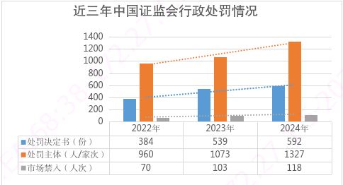2024年,证监会持续加大执法力度,依法从严查办证券期货违法案件739件,作出处罚决定592件、同比增长10%,处罚责任主体1327人(家)次、同比增长24%,市场禁入118人、同比增长15%;向公安机关移送涉嫌犯罪案件和线索178件,同比增长51%。